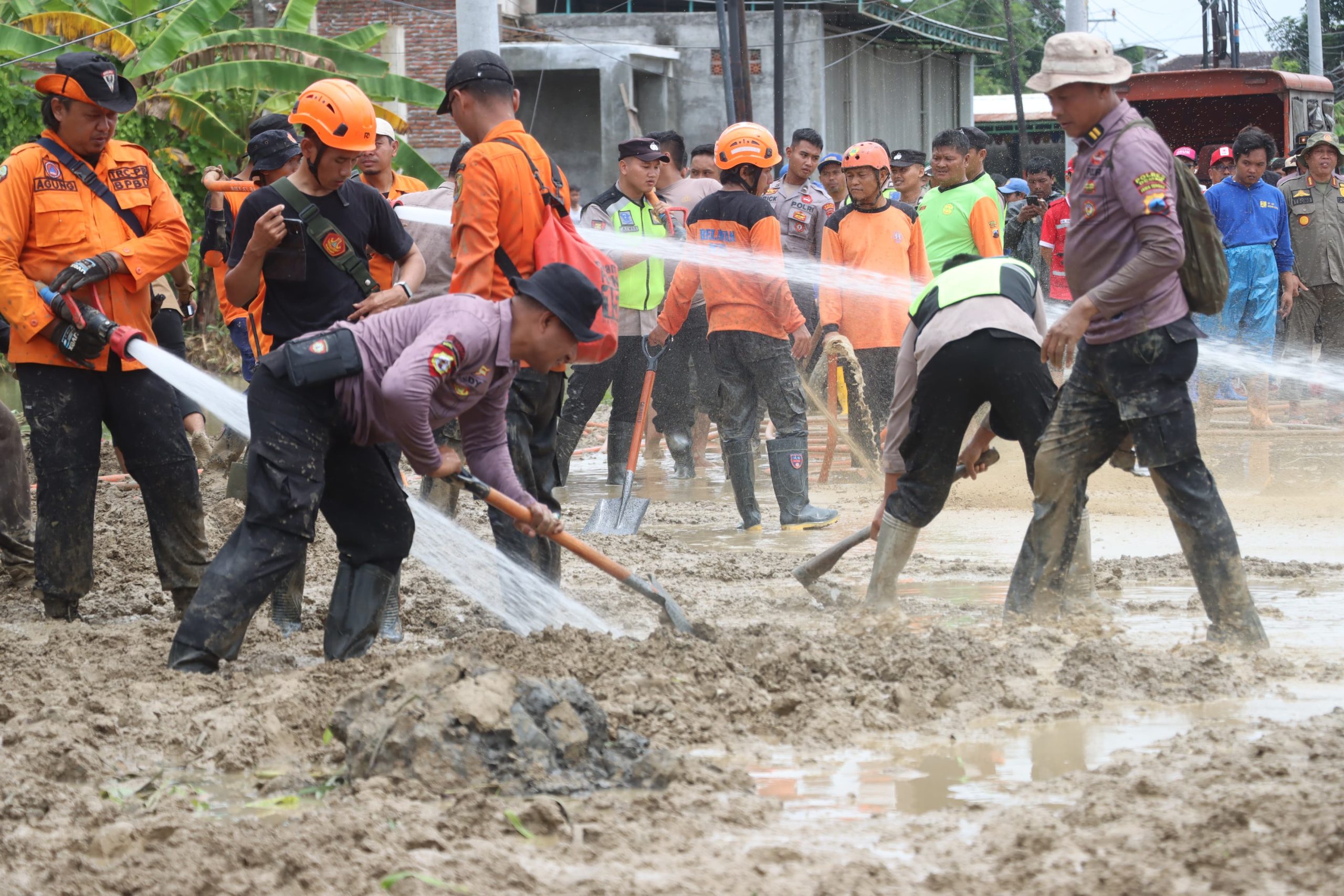 Personel gabungan TNI, Polri, BPBD, PMI bersama masyarakat juga melakukan kerja bakti membersihkan lumpur yang menutup badan jalan guna mempercepat pemulihan akses transportasi.